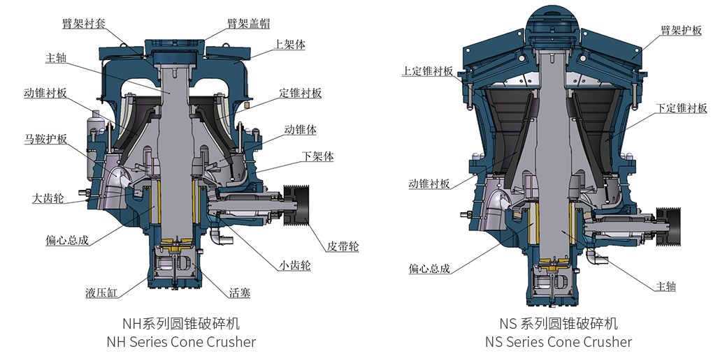電機(jī)經(jīng)由大小齒輪帶動(dòng)偏心套組件旋轉(zhuǎn),由偏心套組件迫使主軸以懸掛點(diǎn)為中心,繞機(jī)器中心線旋擺運(yùn)動(dòng)。動(dòng)錐的運(yùn)行軌跡看起來(lái)是在破碎腔內(nèi)來(lái)回?cái)[動(dòng),同時(shí)緩慢的旋轉(zhuǎn)。物料被擺動(dòng)的動(dòng)錐擠壓破碎;